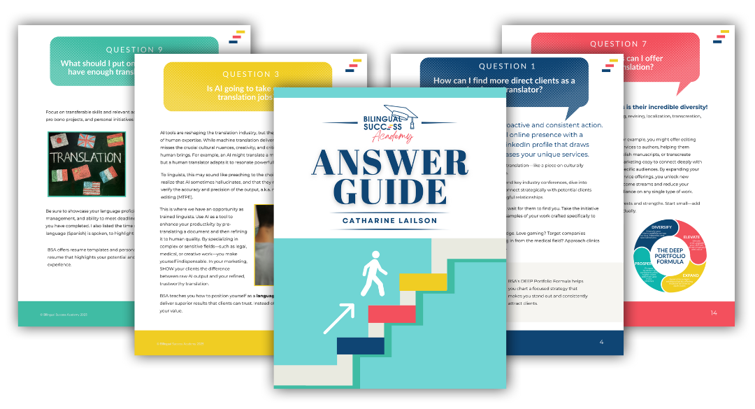 Speaking two languages is a gift, but without training and strategy, you won't be able to unleash its full potential. Too many talented bilinguals are stuck in low-paying projects, inconsistent workflows, and unpredictable income. That’s why I created Bilingual Success—a step-by-step system to help you turn your language skills into predictable freelance income. Because let’s be real—freedom, flexibility, and financial security shouldn’t be left to chance.Â